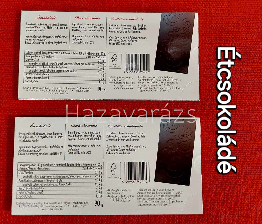 Összetevők: kakaómassza, cukor, kakaóvaj, emulgeálószer: szójalecitin, aroma: természetes vanília.