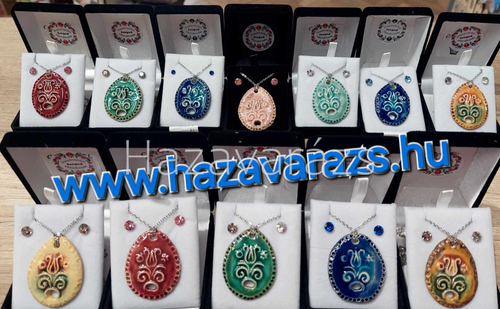 Egyedi kézzel készült szegedi termék. A medál anyaga kerámia, a nyaklánc nemesacél, a fülbevaló: nemesacél és kristály.